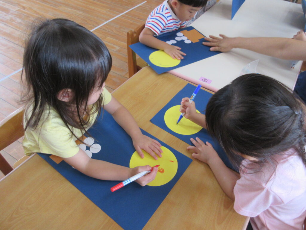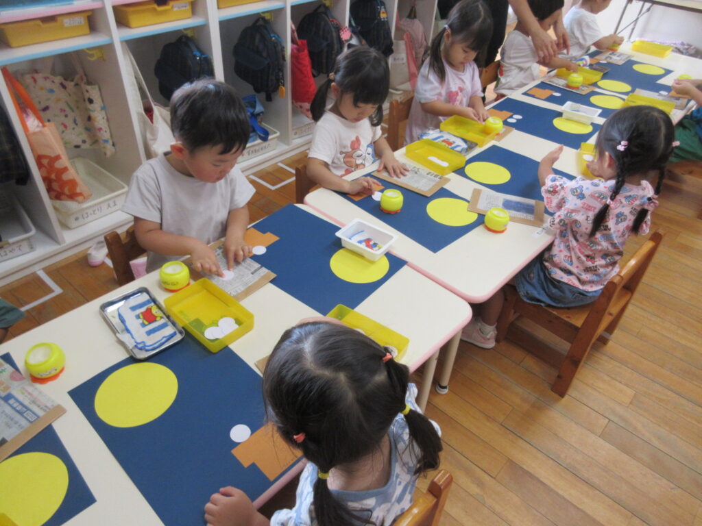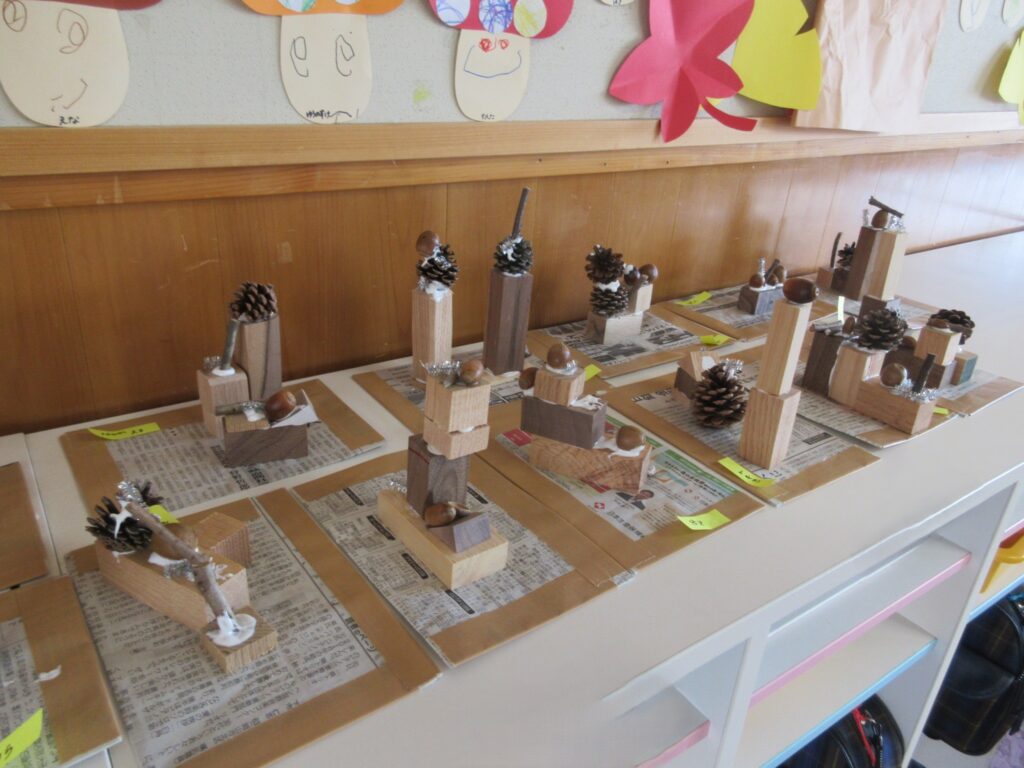 友だちの作っている物にも目を向け、「ケーキみたい」「おうちかな?」など、イメージを膨らませて、楽しみました。