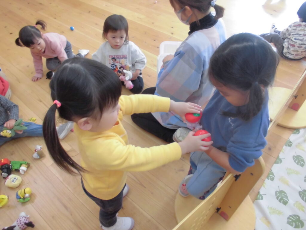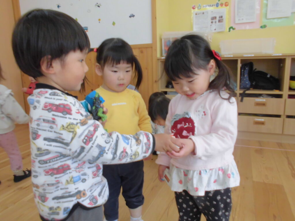 やりとりの中で、思いが強く出てしまい玩具の取り合いや言い合いになることもありますが、その度に「貸して」「どうぞ」を少しずつ学んでいる子どもたちです。