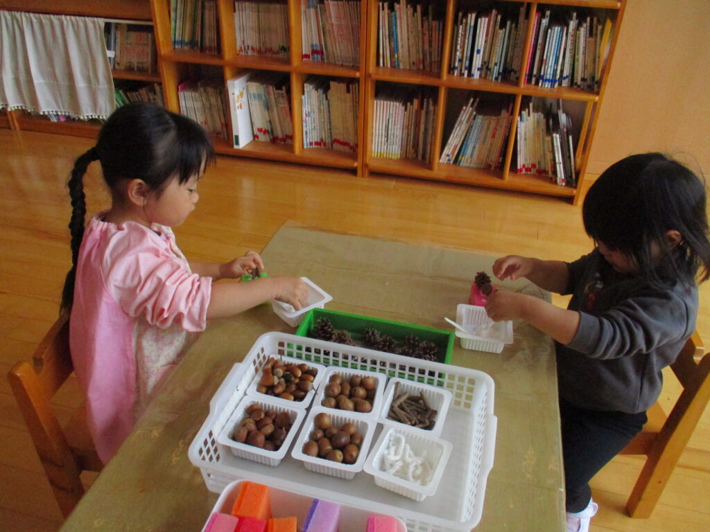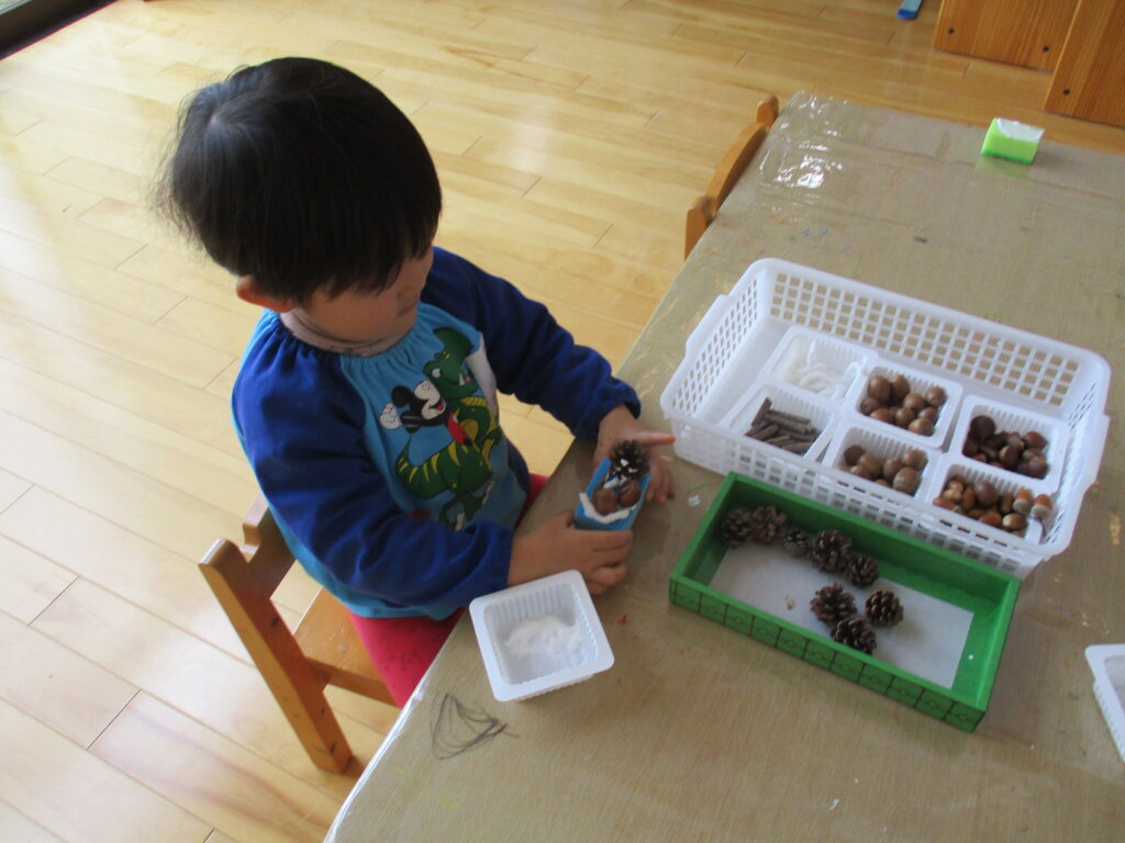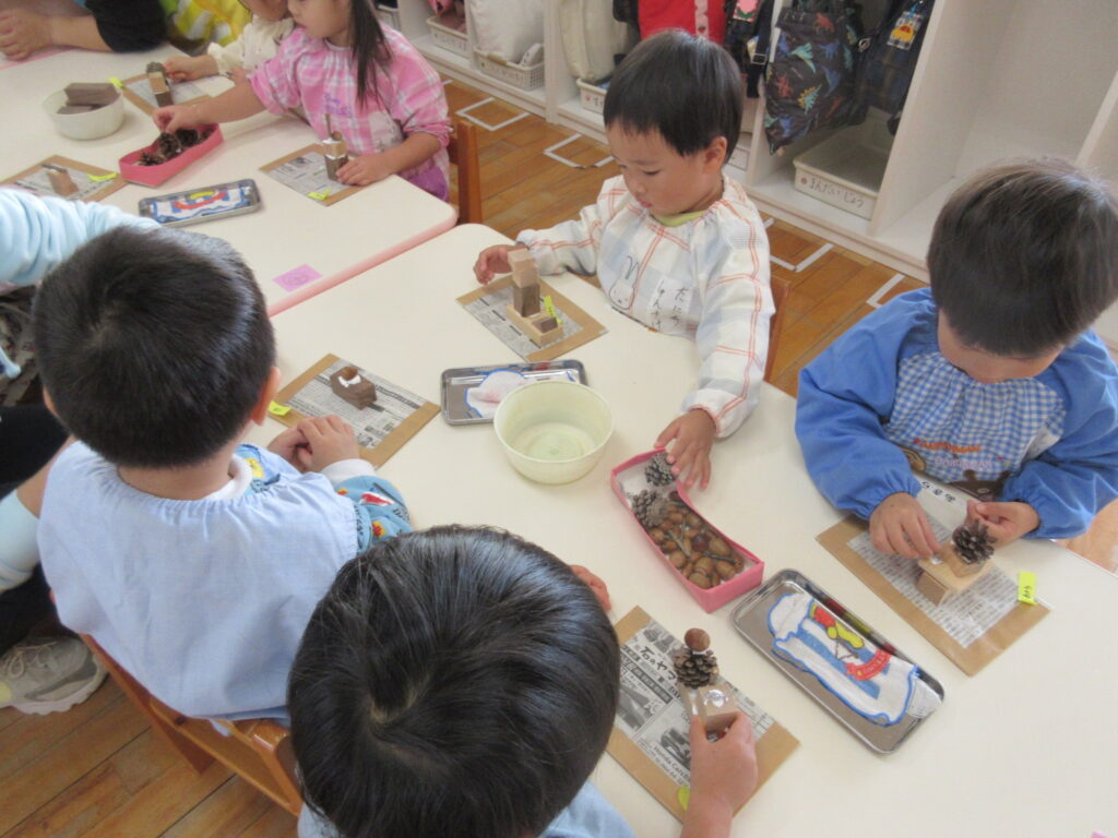 ボンドが乾くまで、とれやすいので、松ぼっくりやドングリをバランスをとって慎重にのせる姿が見られました。