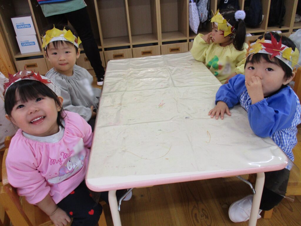紅葉の葉っぱや銀杏の葉っぱを使って、秋の冠づくりを楽しみました!できあがると「みて~!!」と嬉しそうにかぶり、笑顔いっぱいで他クラスのお友だちにみてもらいに行きました。「かわいいね!」と言ってもらい、嬉しそうなうさぎ組さんでした♡
