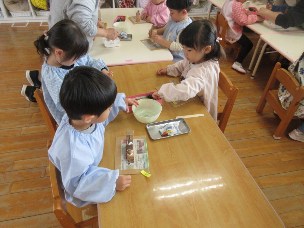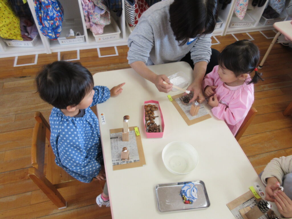 どんぐりやまつぼっくりを使ったケーキ作りでは、そ~っとボンドをつけながら「ここにしようかな?」と考えたり、夢中になって飾りつけをしたりする姿が見られました。完成すると「みてみて!おいしそう!」とみんな喜んで教えてくれました。