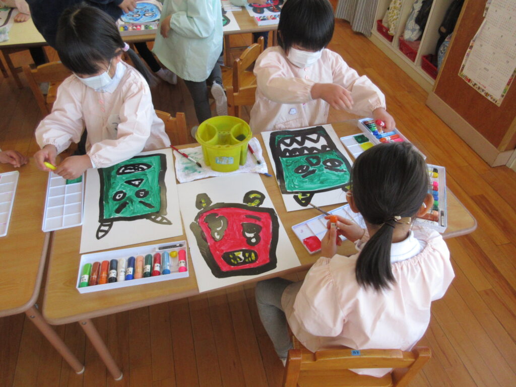 2月3日の節分の日に、お部屋でお友だちと「おにはーそと!ふくはーうち!」と新聞紙で作った豆を投げ合って、鬼を追い払い、福を呼び込みました。遊戯室では、鬼が来て少しこわかったけど、みんな泣かずに、「おにはーそと!」と元気よく鬼を退治しました。また今年も一年元気で過ごすことができるね!