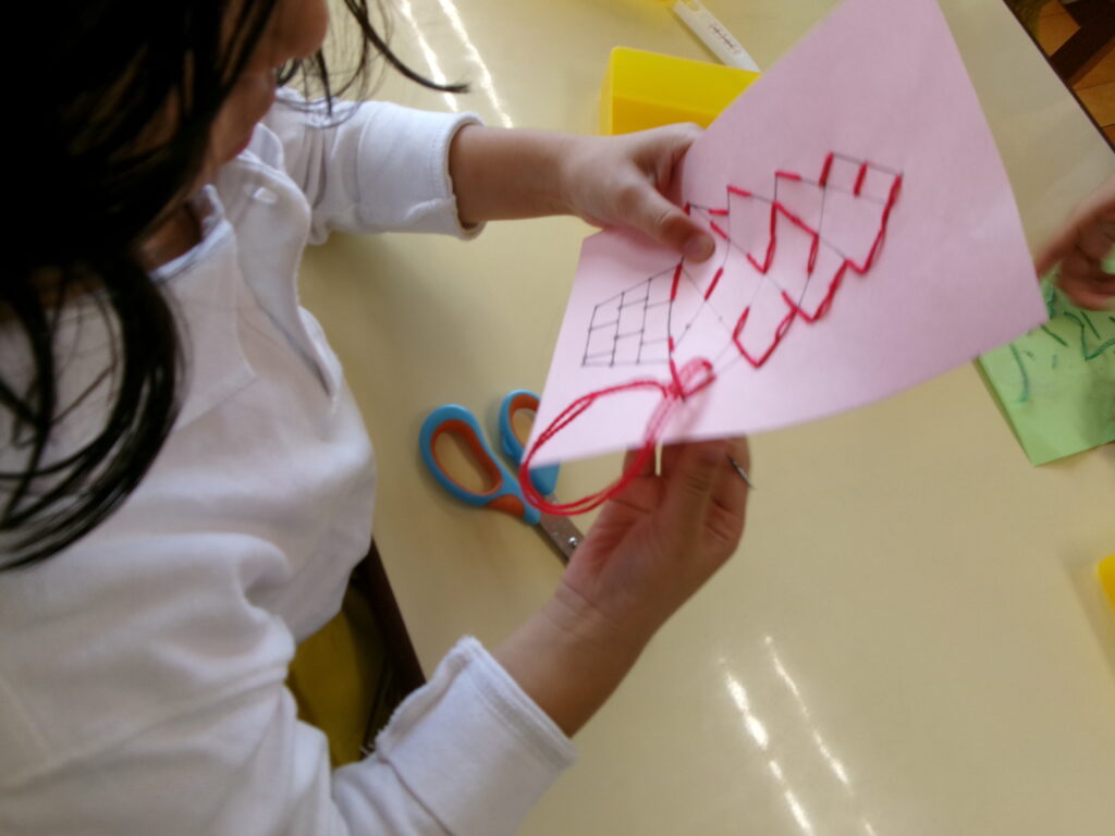 クリスマスツリー制作の途中ですが、少しずつ糸の模様が浮かび上がっていく様子を見て「きれいになってきた!」「あと少しでできそう」と嬉しそうに話す子どもたち。完成を心待ちにしながら、最後まで丁寧に取り組んでいます。