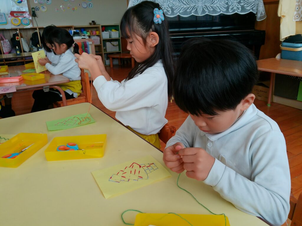 針に糸を通すのが難しかったり、糸がからまったりすることもありますが、針や目打ちの扱いに気をつけながら、慎重に手を動かす姿や、「もう一回やってみよう」「こうやって通すんだよ」と友だち同士で教え合い、励まし合う姿も見られます。年長児らしく落ち着いて取り組む姿勢に、これまでの経験の積み重ねを感じます。