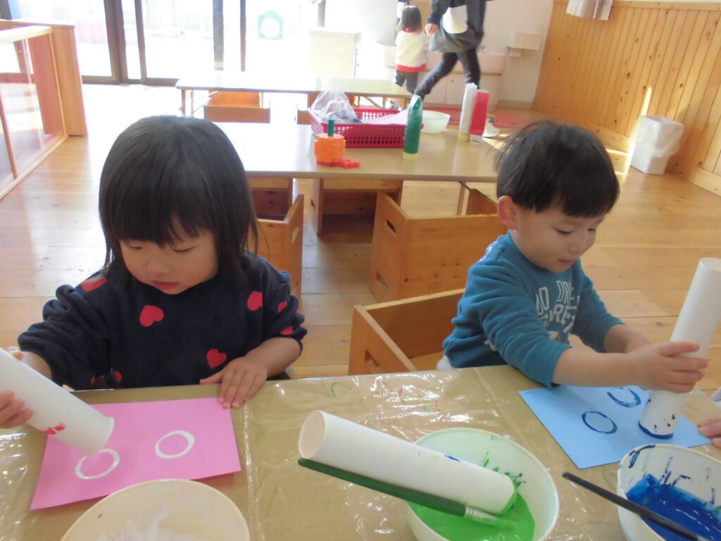 今回は、キッチンペーパーの芯を使ったスタンプあそびに挑戦!