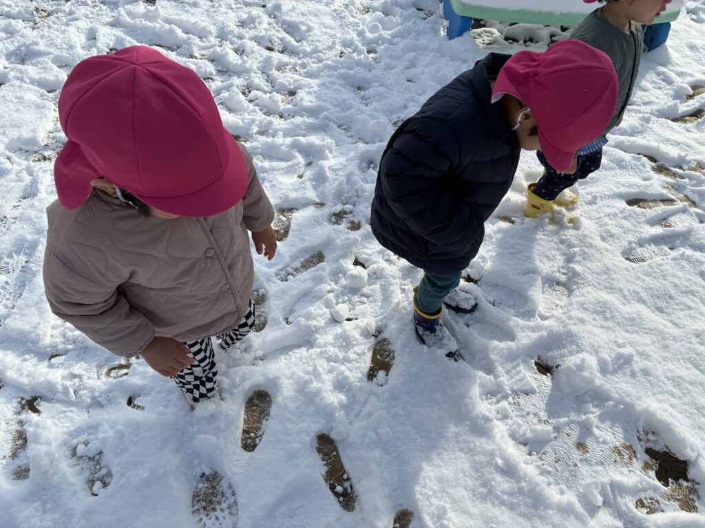雪がたくさんつもり、雪あそびができました⛄♡園庭に出ると「わあ!!」と駆け出しながら、雪の上を踏んだり、手で雪のふわふわな感触を感じたりとそれぞれ楽しんでいたうさぎ組さん。雪の上を歩くと自分の足跡が残る様子を嬉しそうに見ていました。
