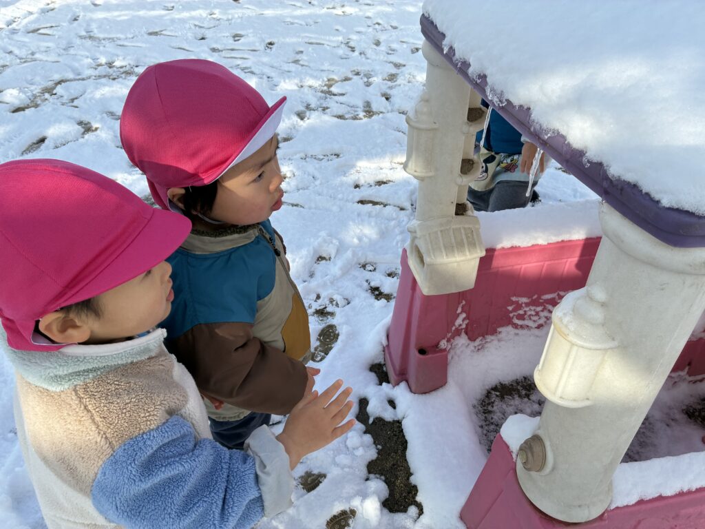 園庭にある遊具を見てみると…なんとつららが!!子どもたちは「こおりだ~!!」と嬉しそうに発見し、「つららだよ」と教えてあげると「つらら!!」と繰り返し話す姿が見られました。つららにそ~っと手を近づけながら、さわってみたり、お友だちや先生に見せてあげたりする姿も見られました。