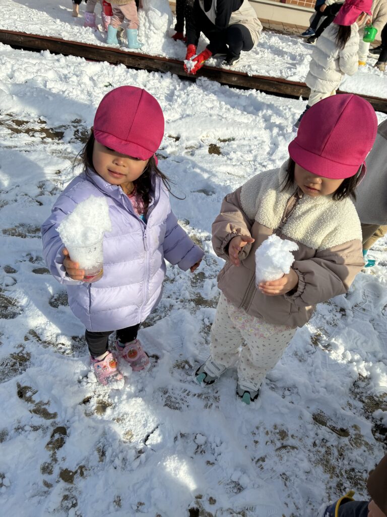 以前、氷作りにチャレンジしていたコップの水が、再び氷になっていたり、その上にふわふわな雪が積もっていたりとたくさんの発見が感じられた雪あそびになりました♡