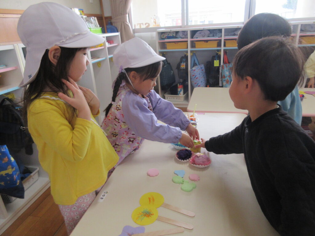 お店屋さんごっこをしました。みんなで、何がいいか話し合って品物づくりをしました。みんなのアイデアで、クッキー、ケーキ、ジュース、キャンディーに決まりました。